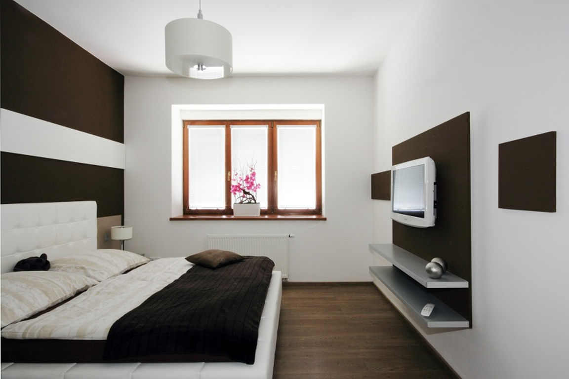Jediné, co si majitelé z původního bytu převezli, byla postel, se kterou už počítali do nového byd- lení. Čalounění postele do geometrických obraz- ců posloužilo jako inspirace k dalším krokům. „Abychom prostoru dali vtip, vymysleli jsme si motiv hnědých a bílých kostek, který se promítá na protilehlých zdech. Světle hnědé pruhy zase opticky člení plochu skříněk do bílých čtverců a obdélníků,“ popisuje architekt. Velká hnědá kostka na zdi naproti posteli je i praktickým prvkem, neboť slouží jako nosný panel pro televizi a police, dále jako skrýš pro přívodní kabely.